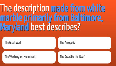 If you can answer "If you are in the city of Cork, where are you?" and maybe even "The description "made from white marble primarily from Baltimore, Maryland" best desc.." there is a good chance that you're going to beat the average score of 6/10 in this Geography quiz