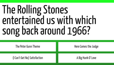 5/10 is what people on average are scoring in this 1960s Songs quiz so far. Are you ready to answer questions like "The Rolling Stones entertained us with which song back around 1966?" and "Sonny and Cher entertained us with which song back around 1966?"
