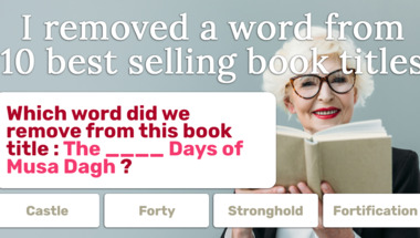 6/10 is what people on average are scoring in this trivia quiz so far. Are you ready to answer questions like "Which word did we remove from this book title : "The ____ Days of Musa Dagh" ?" and "Which word did we remove from this book title : "____ In My Own Heart's Blood" ?"